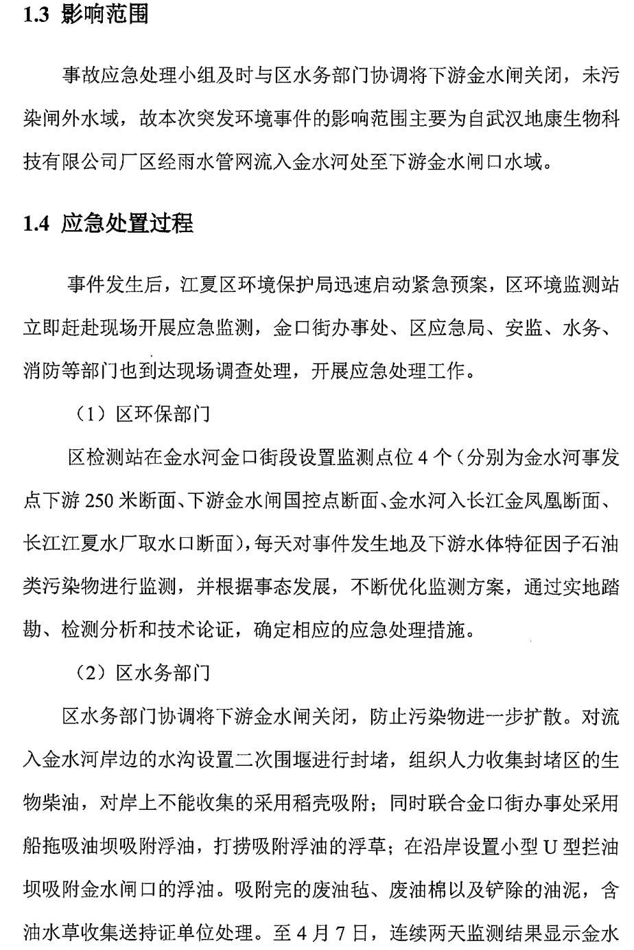 区环保局应急处置人员迅速赶赴现场,对周边环境和事件原因调查处理。经查,武汉地康生物科技有限公司主要生产农用微生物菌剂,每年的1、2、3、12月等4个月有一台套2蒸吨生物柴油锅炉运行。3月27日凌晨,该公司工人对日用柜添加生物柴油时,由于工人脱岗,导致小油箱生物柴油漫溢,经厂区雨水管网流入金水河。