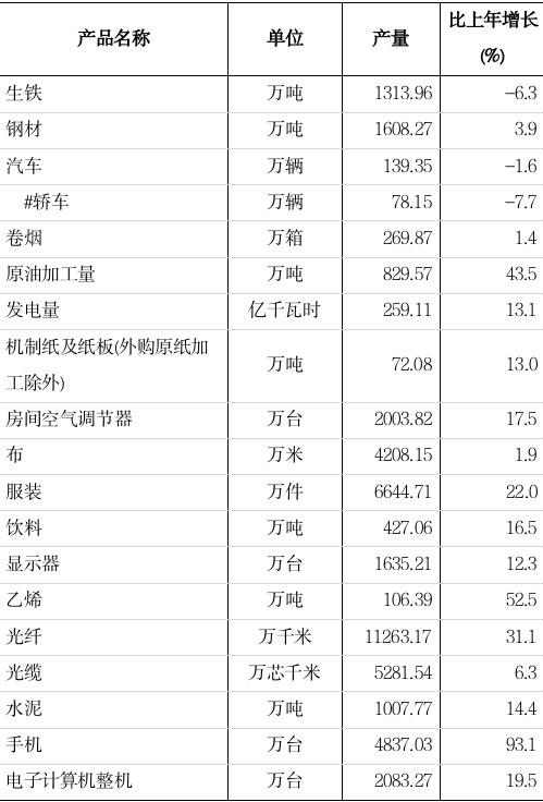 工业:全年工业增加值4586.49亿元,比上年增长14.1%。规模以上工业增加值增长14.2%。其中,计算机、通信和其他电子设备制造业增长48.8%,石油、煤炭及其他燃料加工业增长21.9%,非金属矿物制品业增长25.3%,化学原料和化学制品制造业增长43.1%。